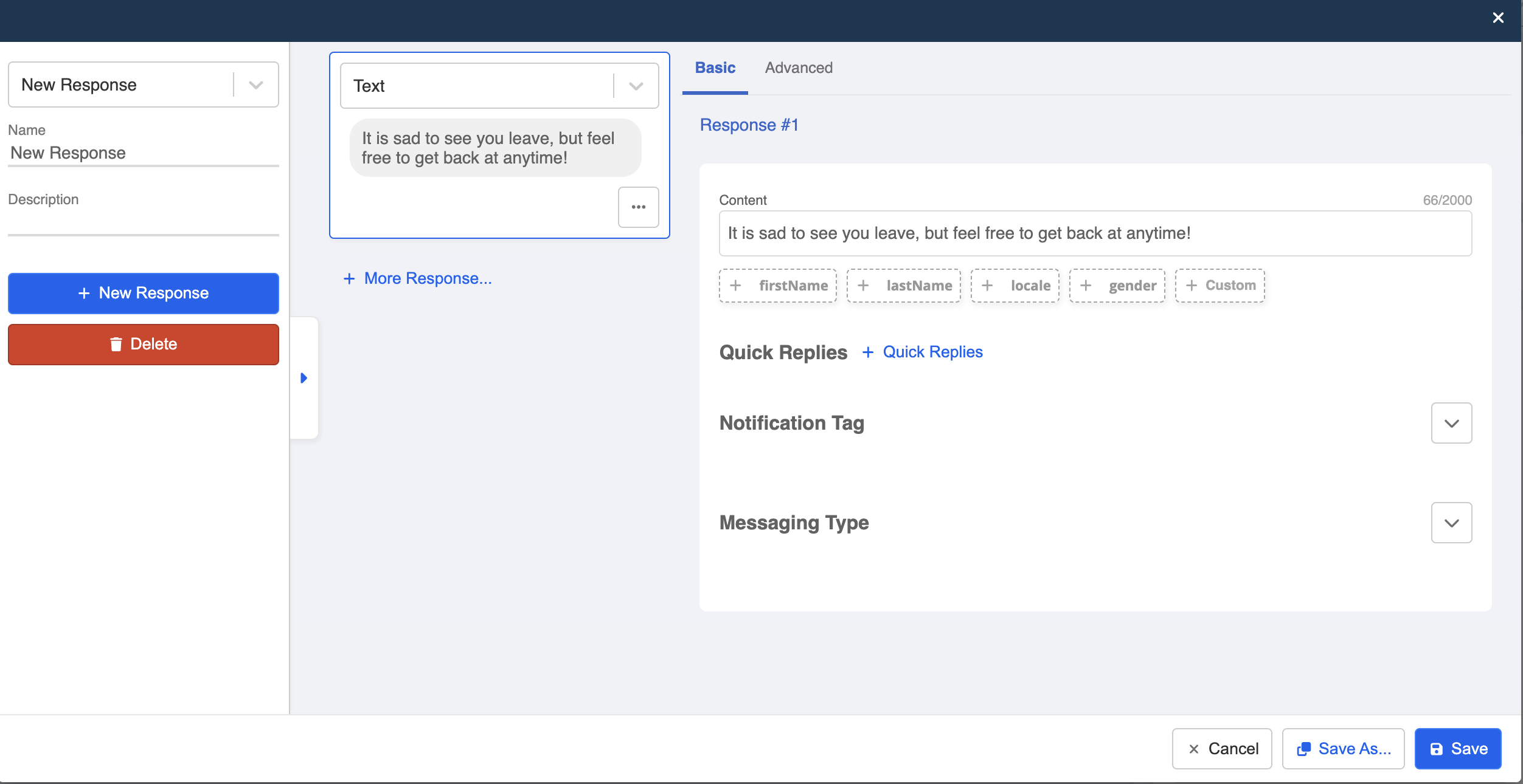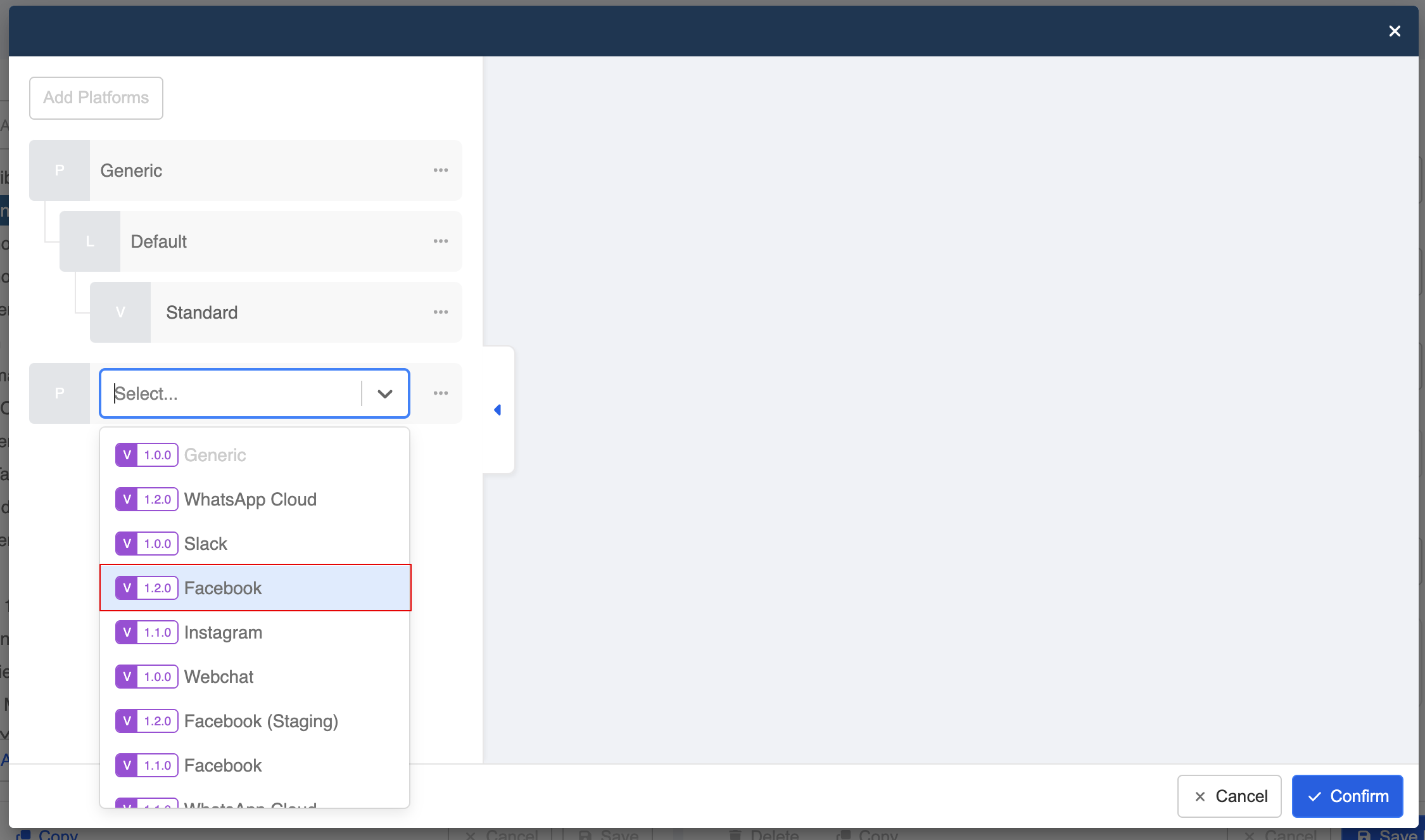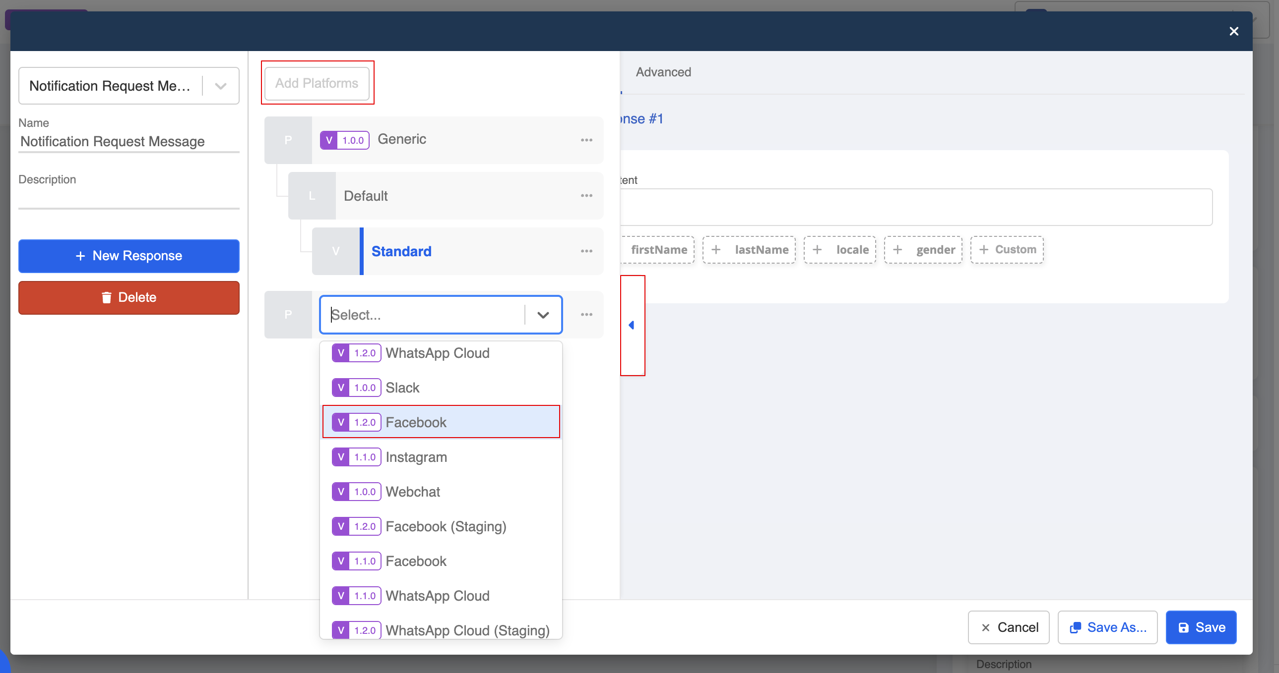 - Create a new response. Then, create a platform specific response and select "Facebook v1.2.0".