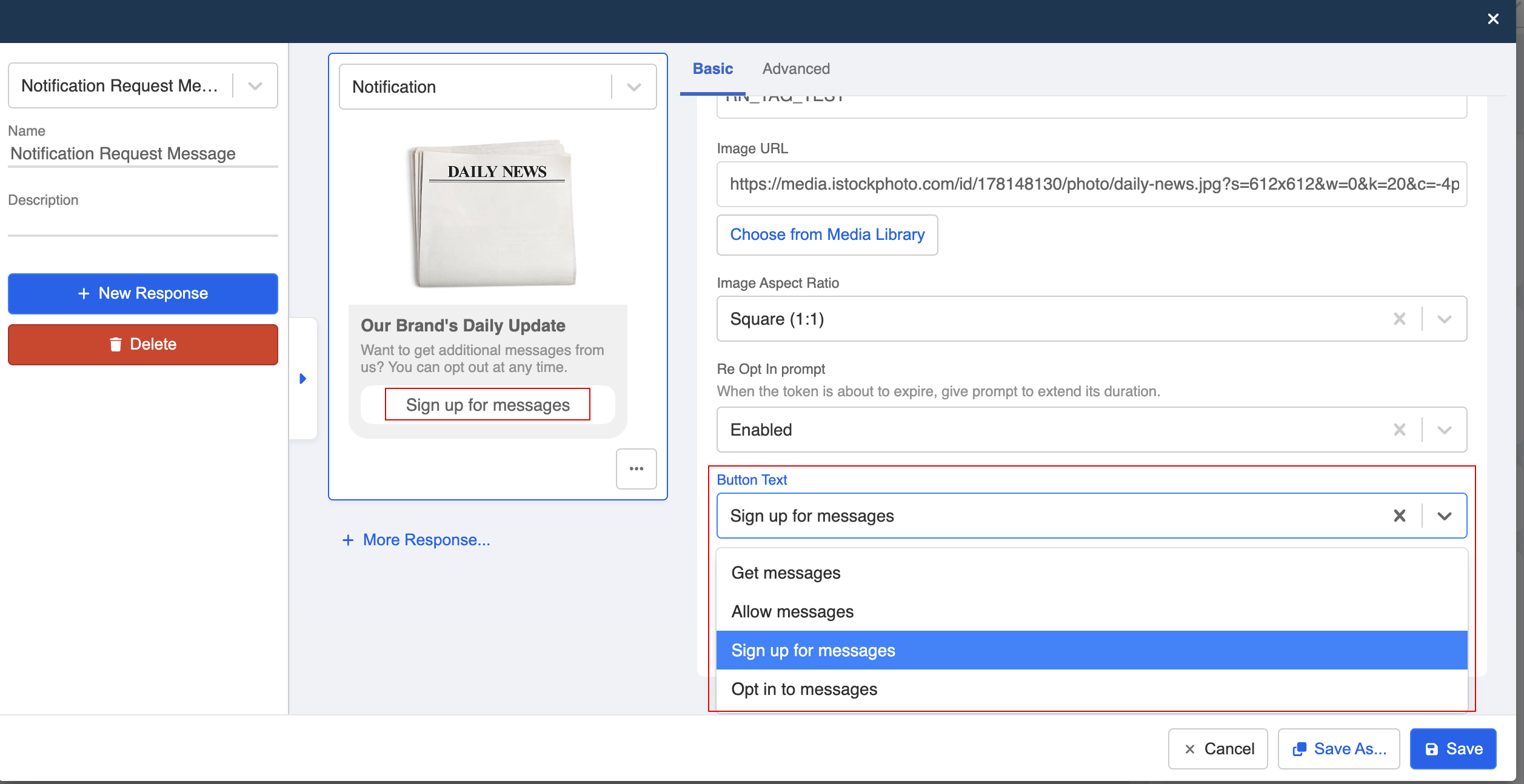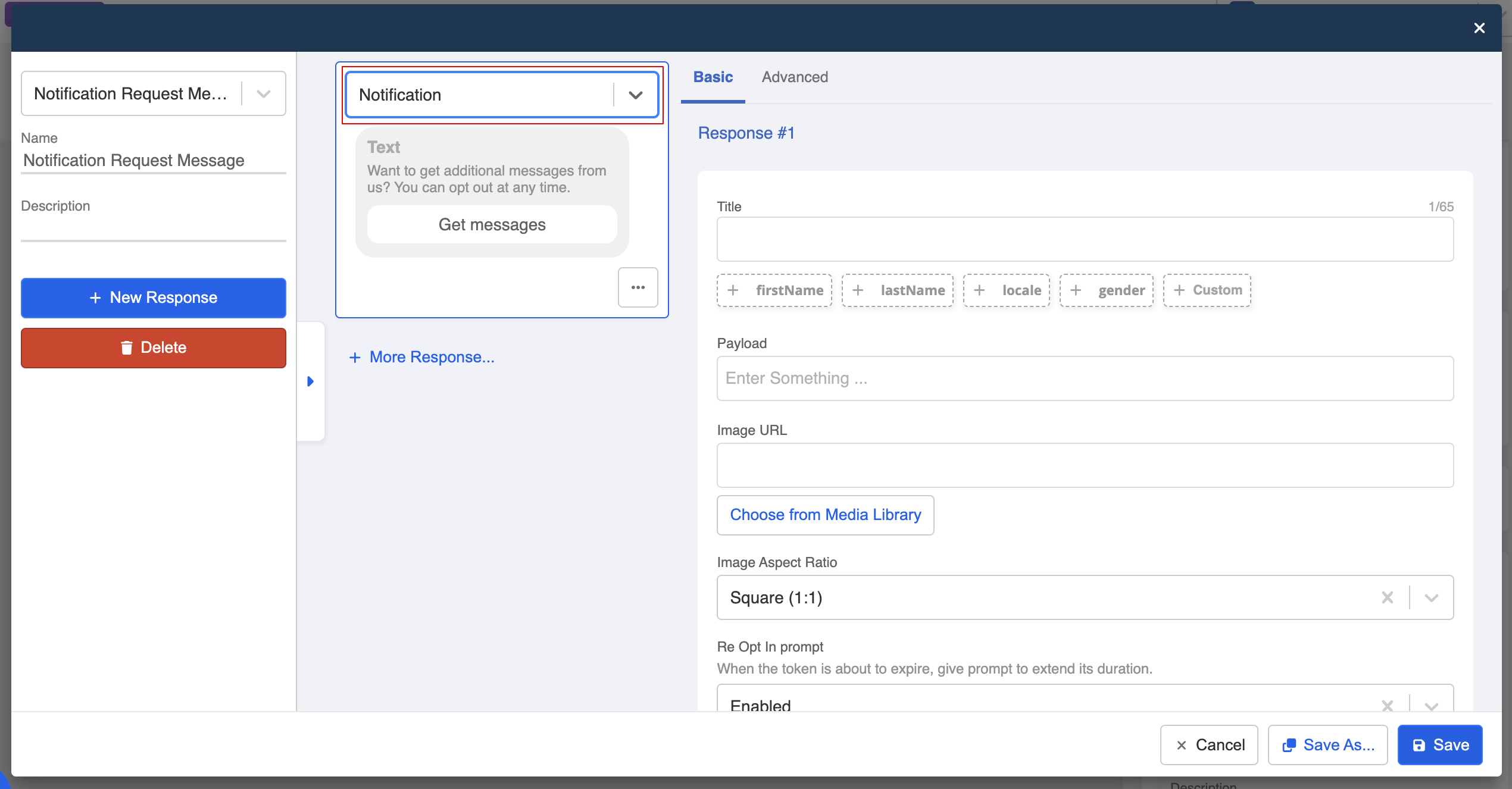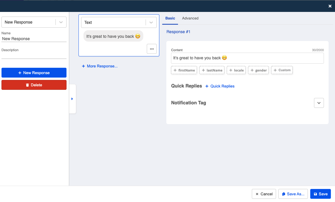 - Create a new response. Then, create a platform specific response and select "Facebook v1.2.0".