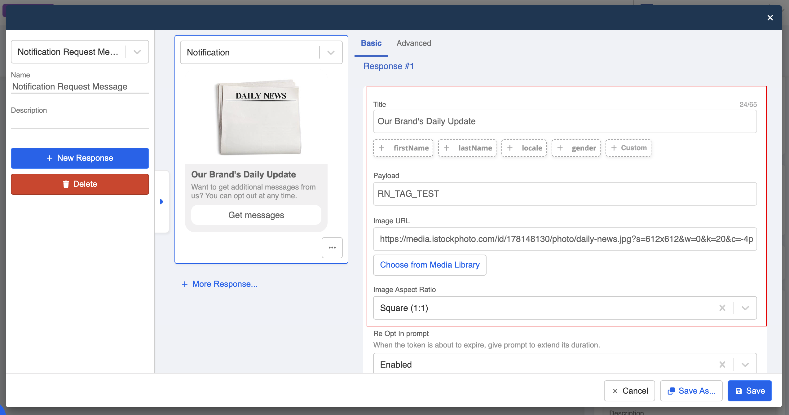 - Create a "Title", and a case-sensitive "Payload", which is also the Notification Tag. Optionally, you can attach an "Image" with the selected "Image Aspect Ratio".
