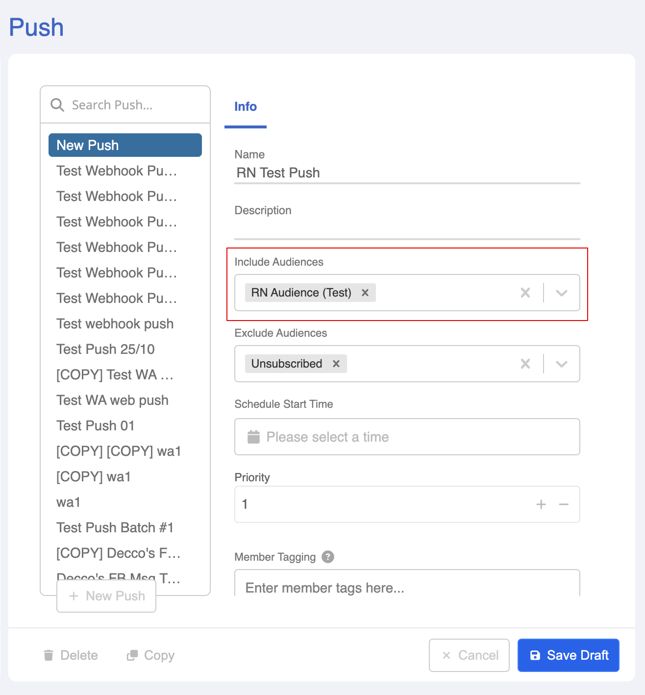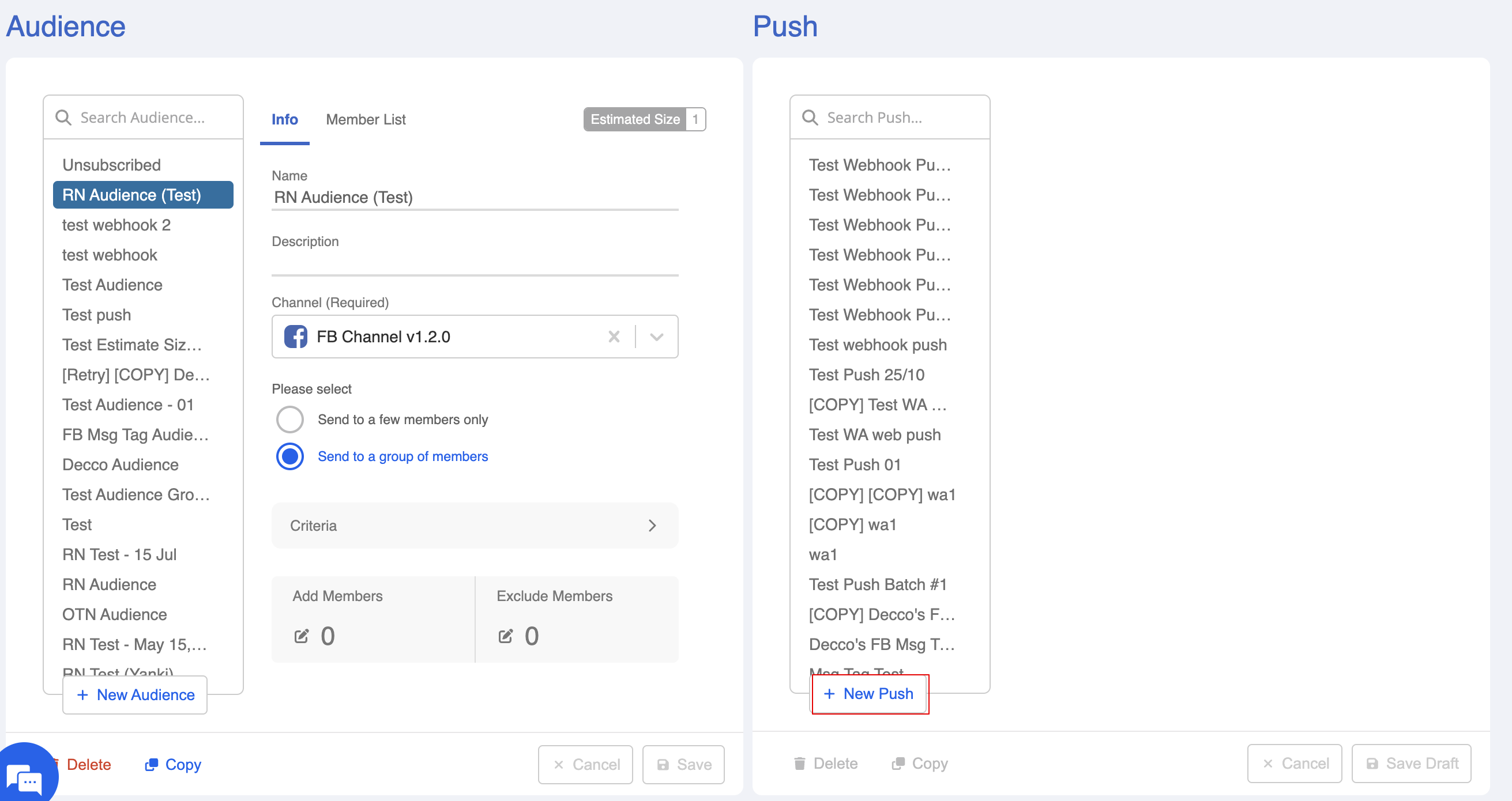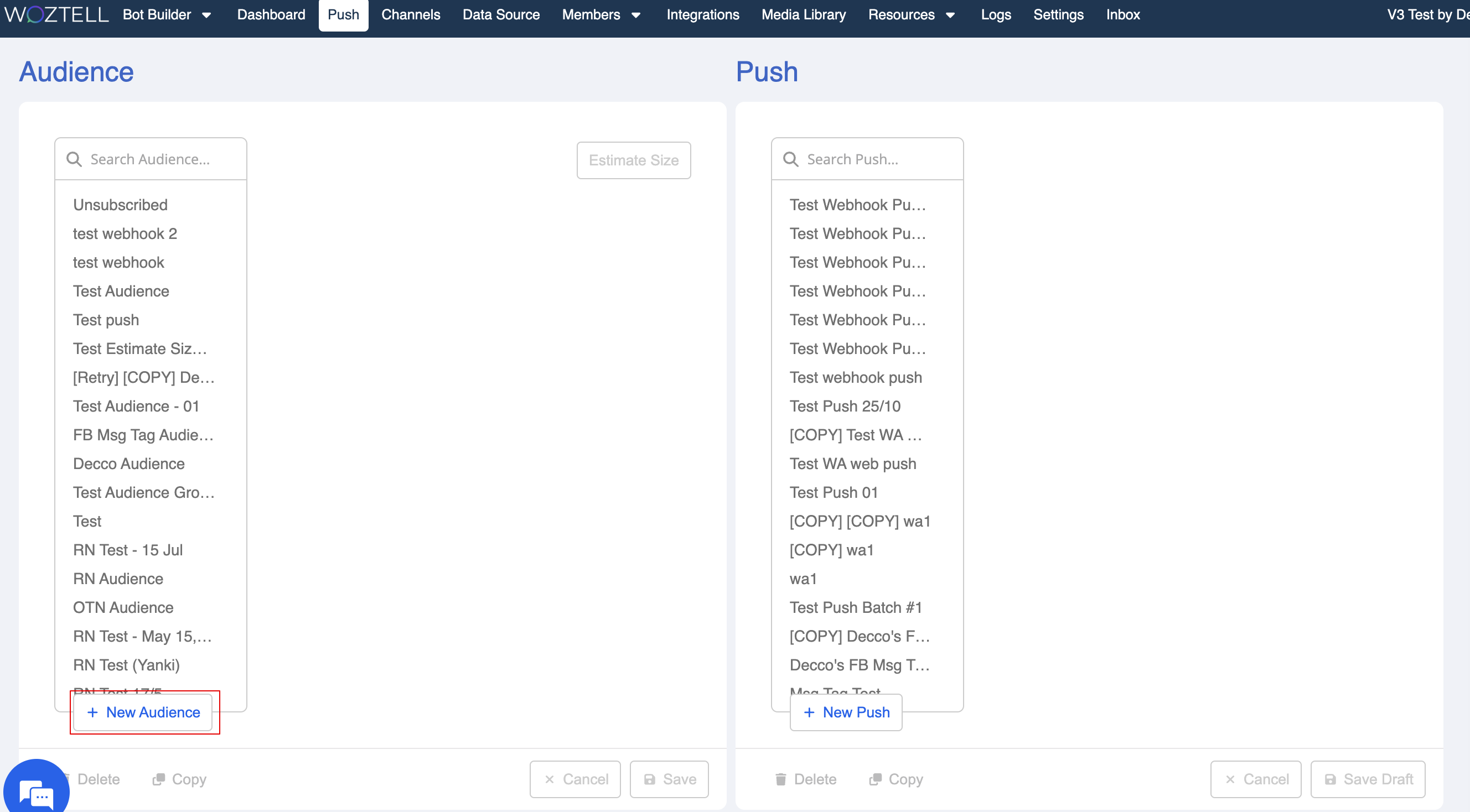 - Head to Push. Select "+ New Audience" to create a new audience group.
