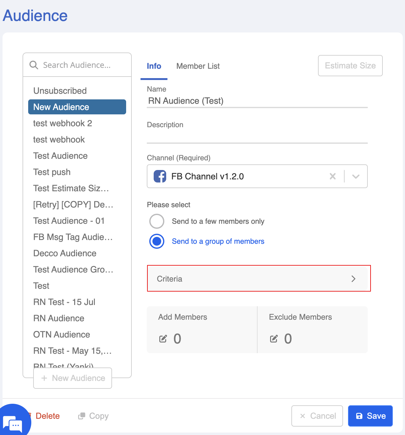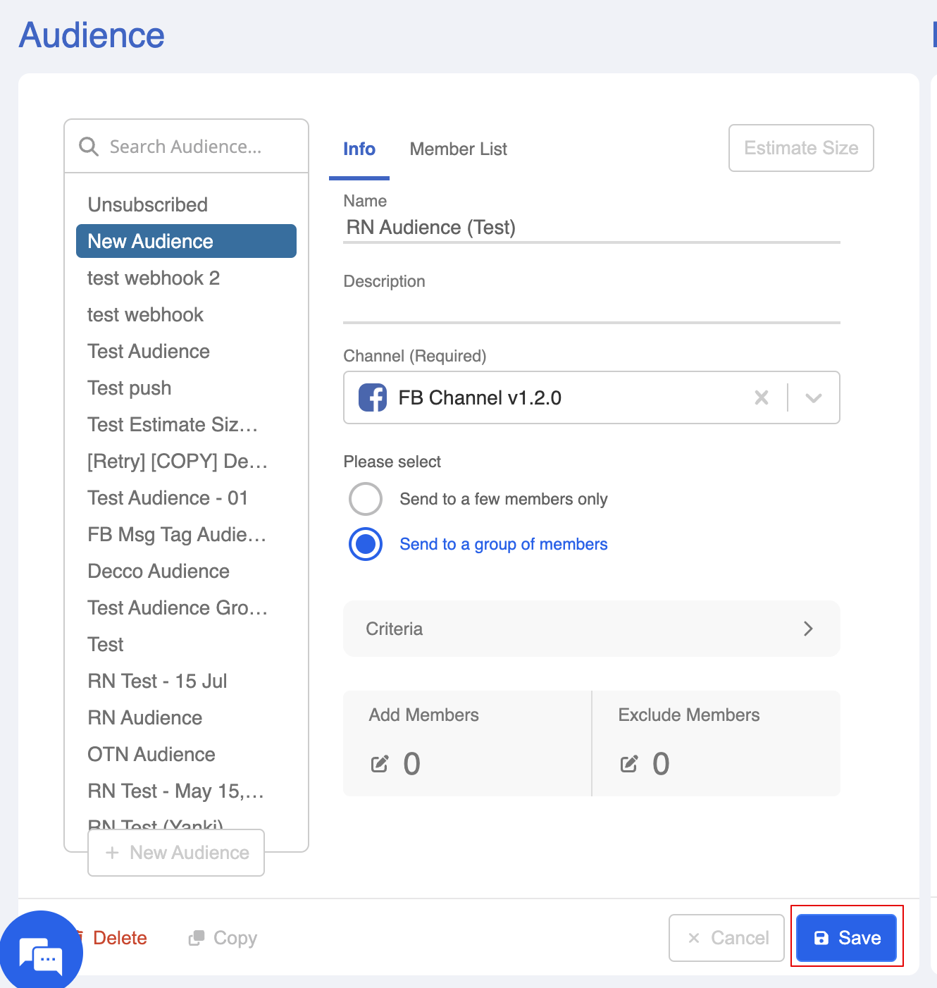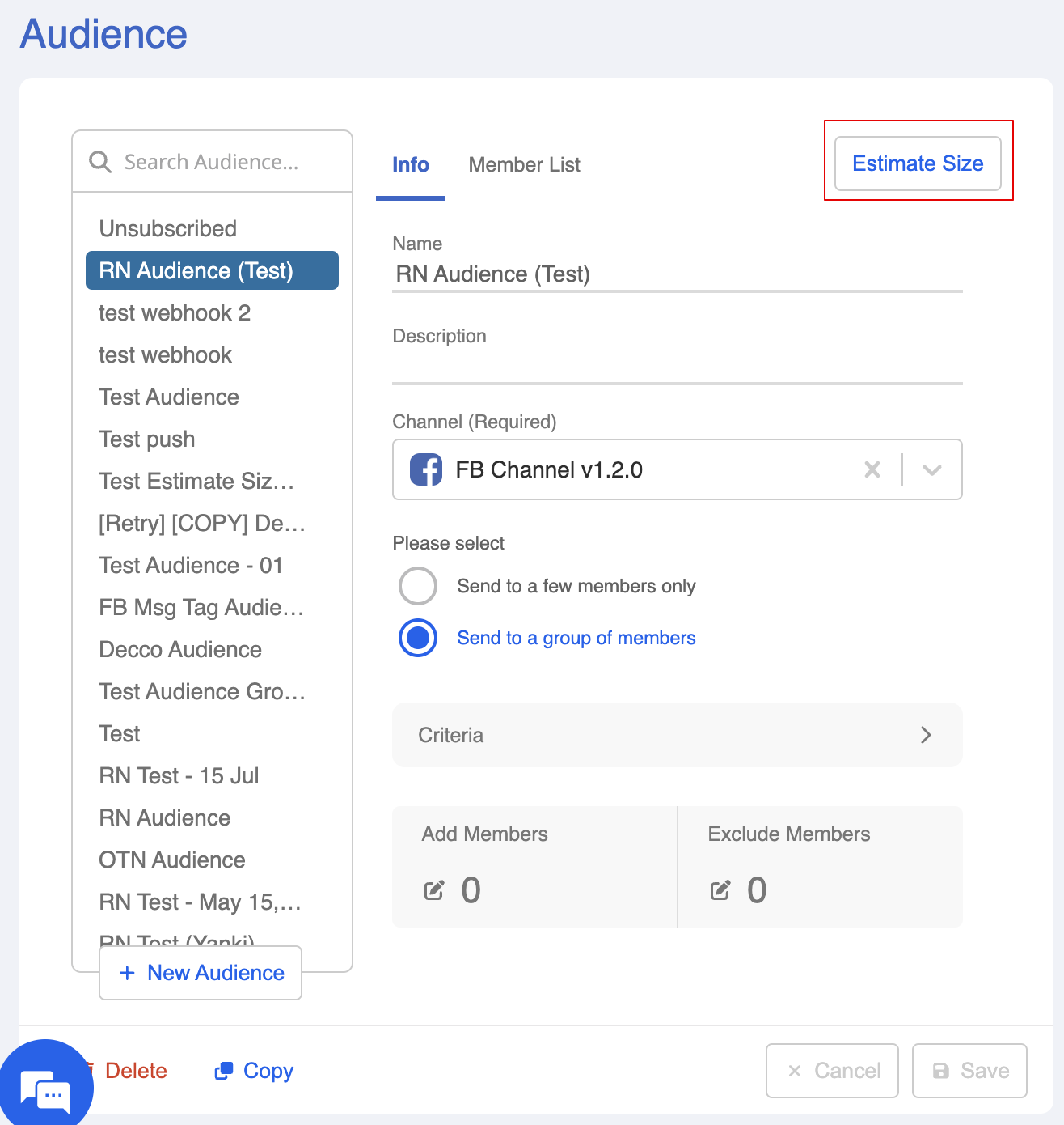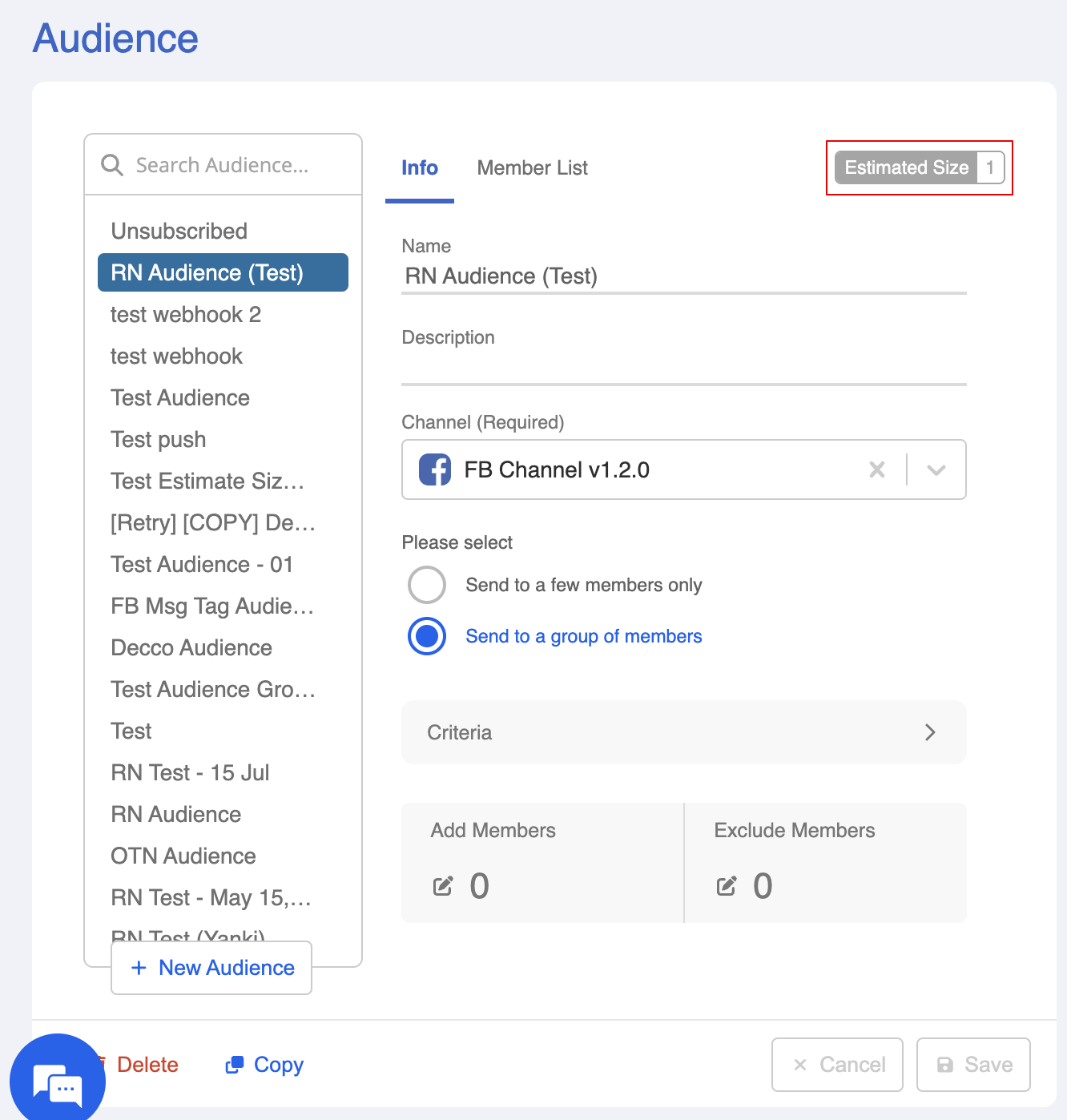 - You can click "Estimate Size" to view the audience count of this group. When the Marketing Notification Tag is applied to the criteria, this audience count will grow when more members are added with this tag.