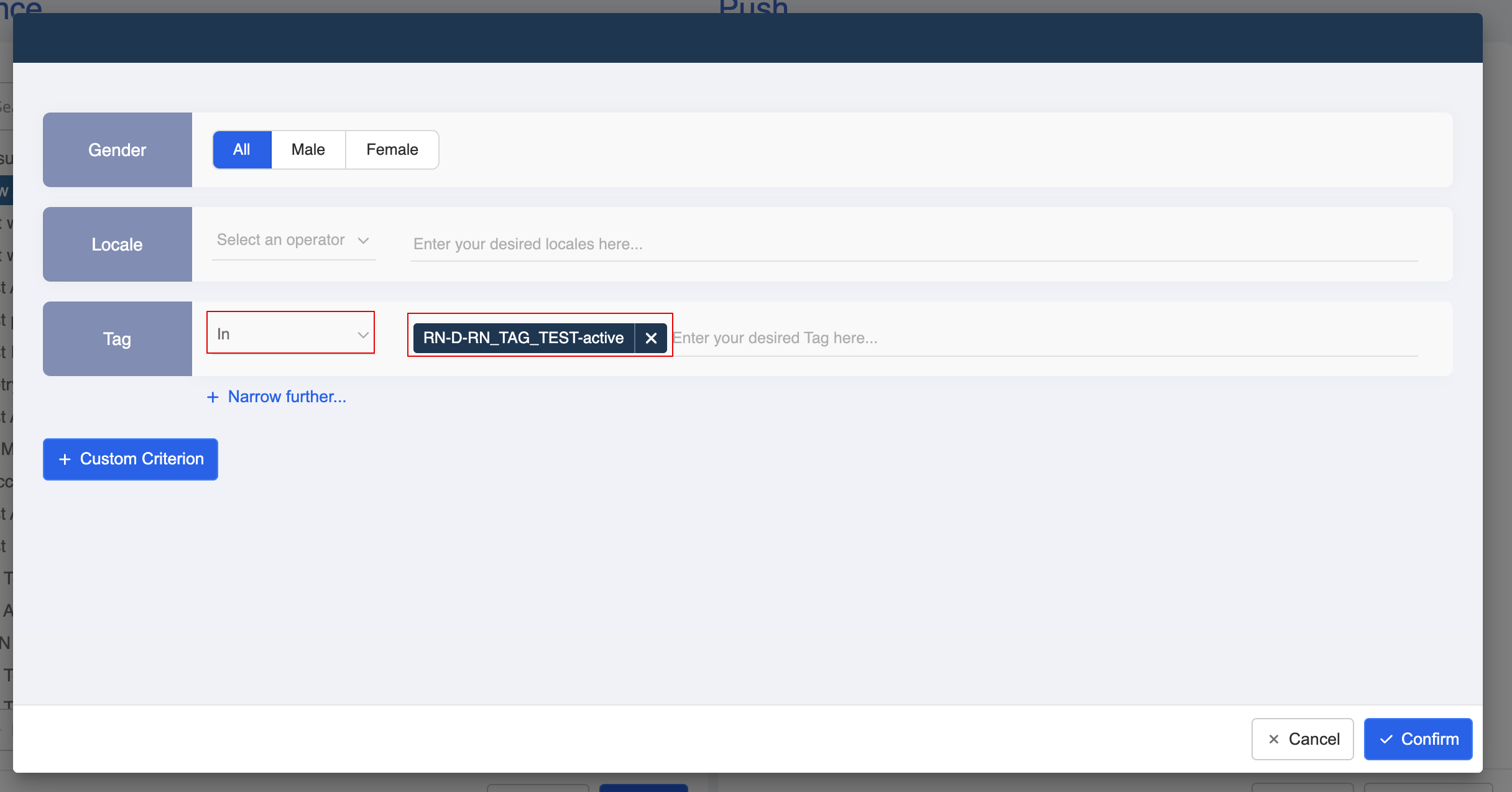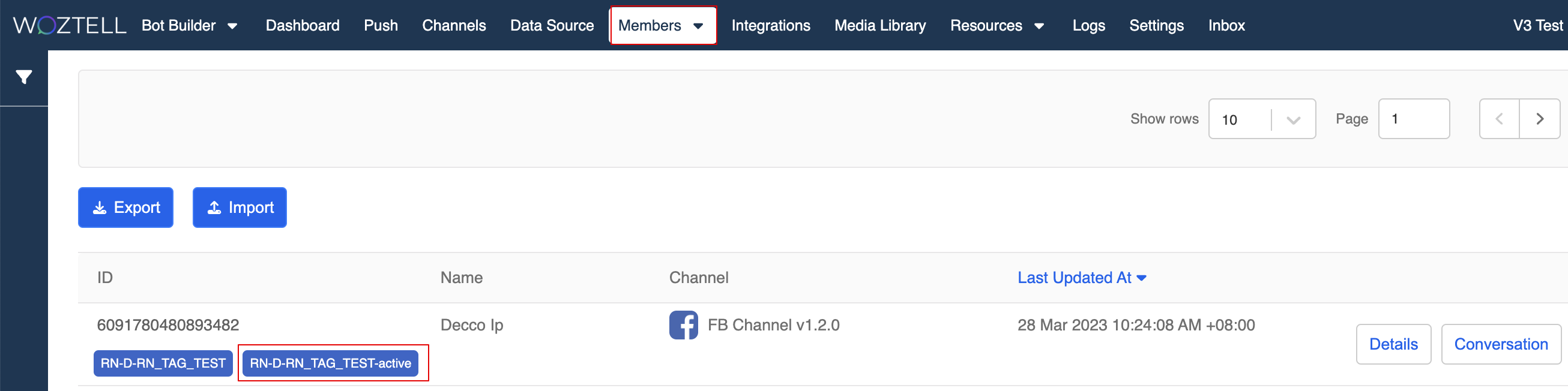You can find the tags in members page as well. Users who have agreed to receive marketing message will be labelled with 2 tags: RN-D-${rnToken.tag} and RN-D-${rnToken.tag}-active.