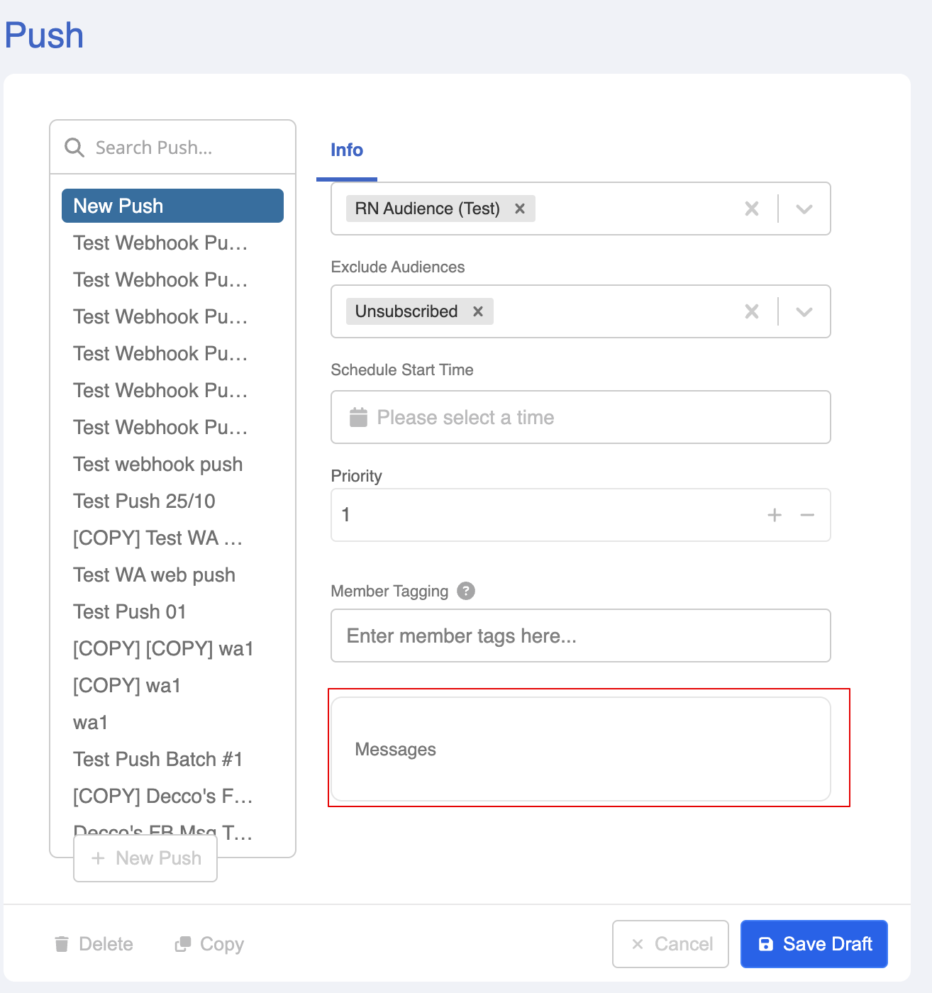 - At the right side of Push Panel, select "+ New Push" to create a new push.