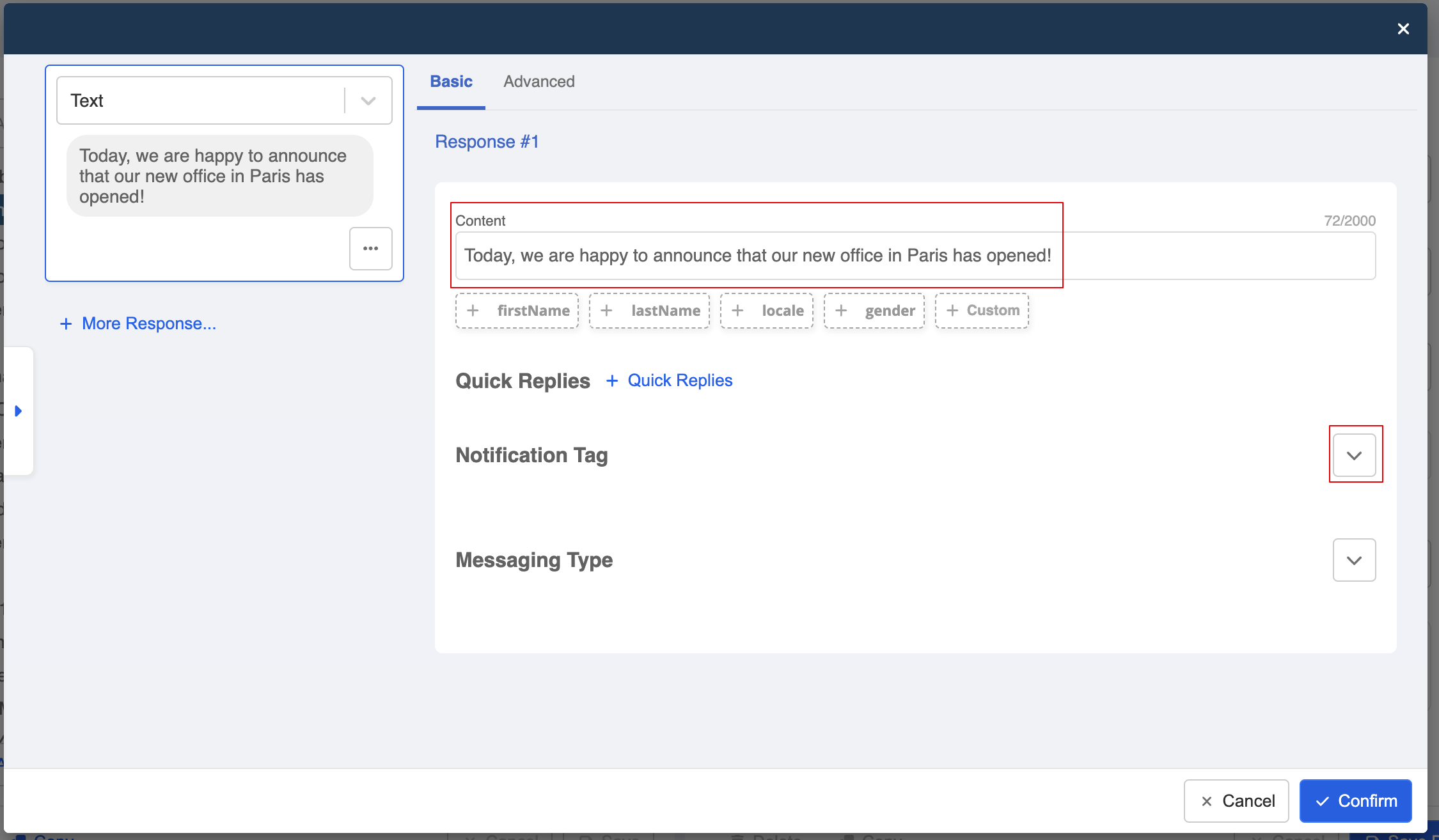 - Enter the text content for the push message. Then, expand the "Notification Tag" section.