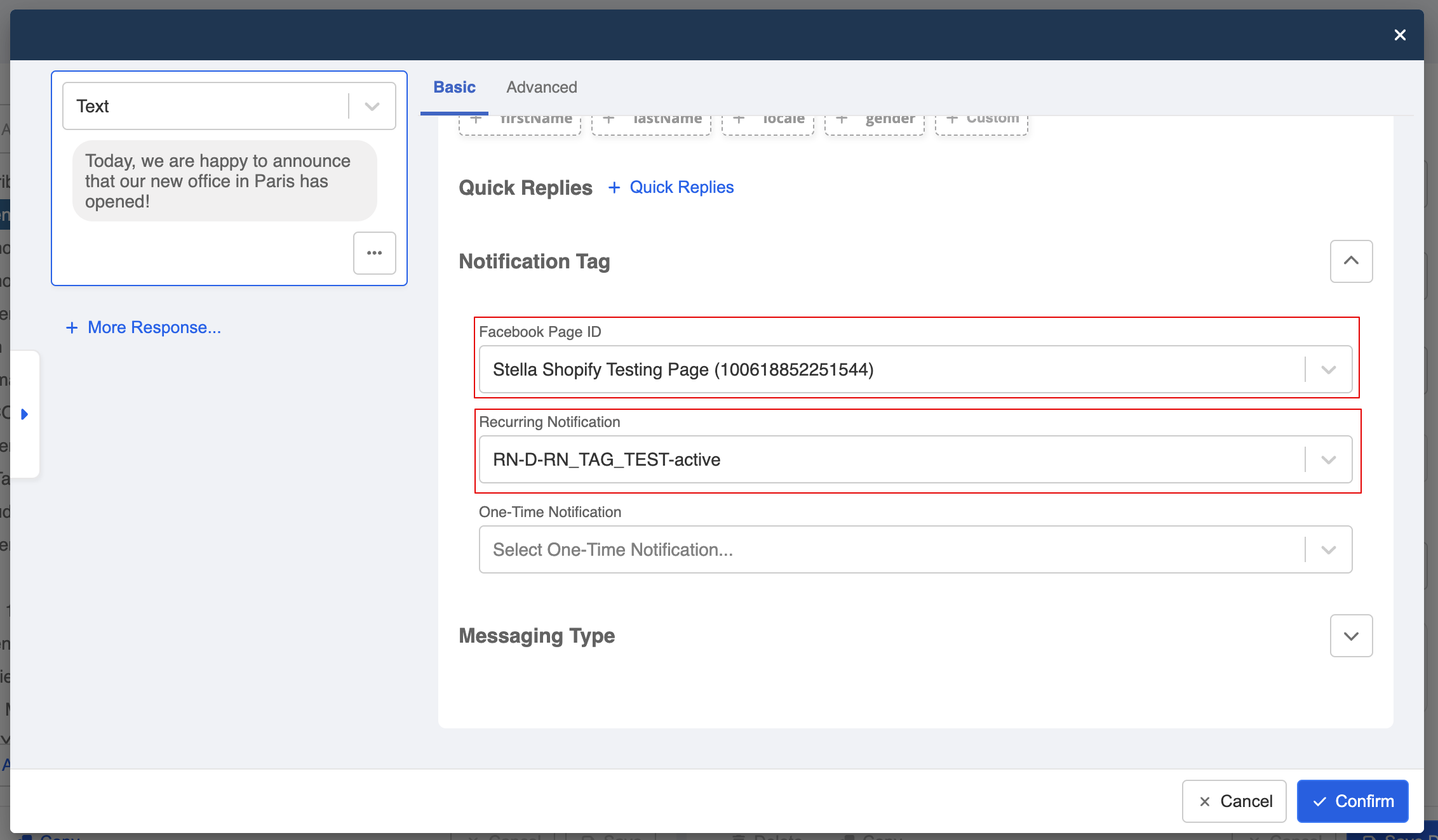 - Select the corresponding Page ID and Marketing Notification Tag from the dropdown lists. For the RN Tag, please select the "active" tag.
