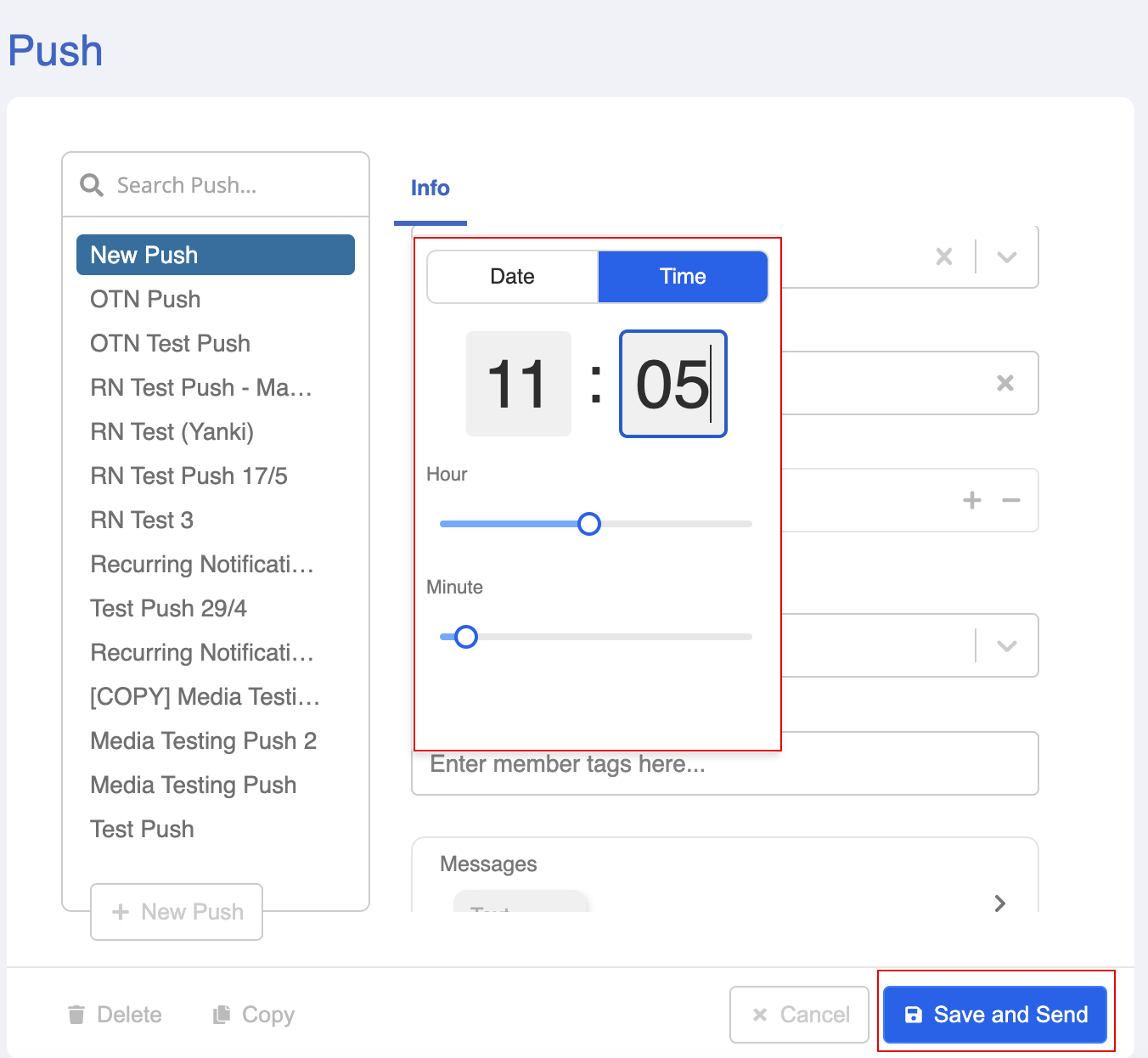 - Schedule a date and time for sending the push message. Finally, click "Save and Send" to send the push.