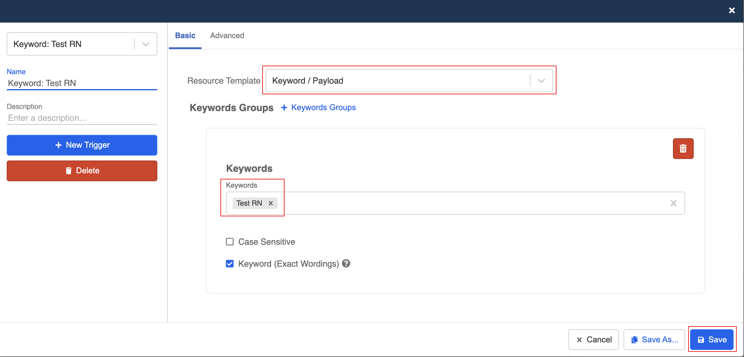- Create a new trigger. Under "Keyword / Payload", create a keyword and save it. In this example, let's take "Test RN" as the keyword.