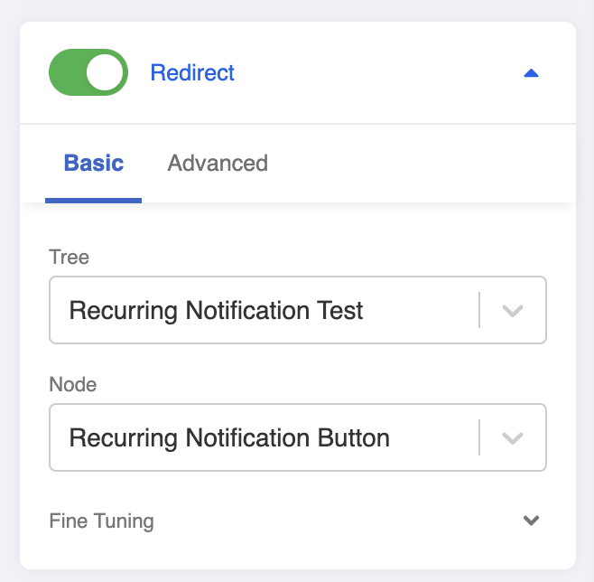 - Switch on "Redirect" and link back to the Unsubscribe tree node.