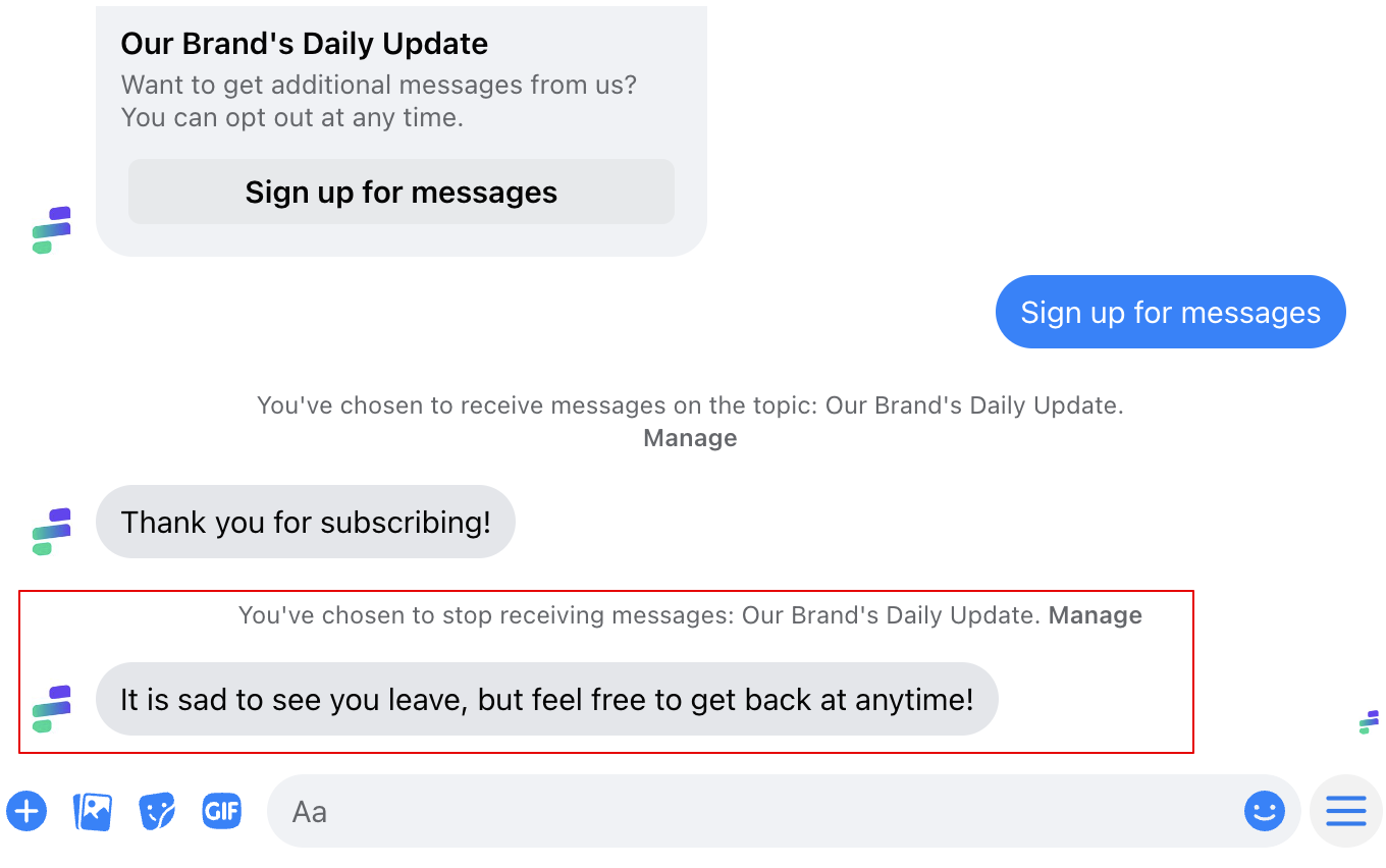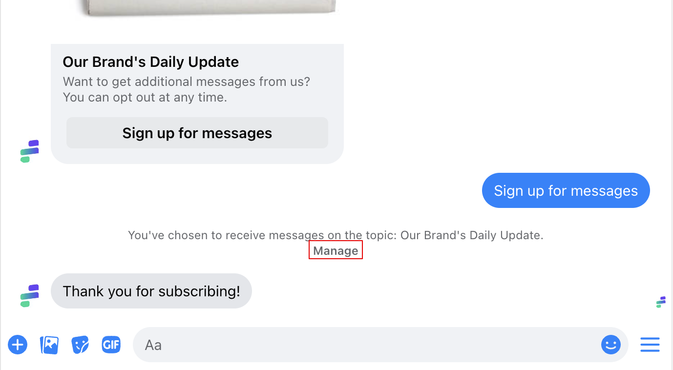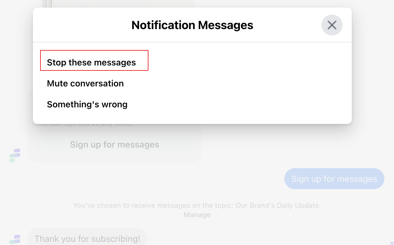 - In Messenger, the user can click on "Manage" to modify their consent for marketing notification.