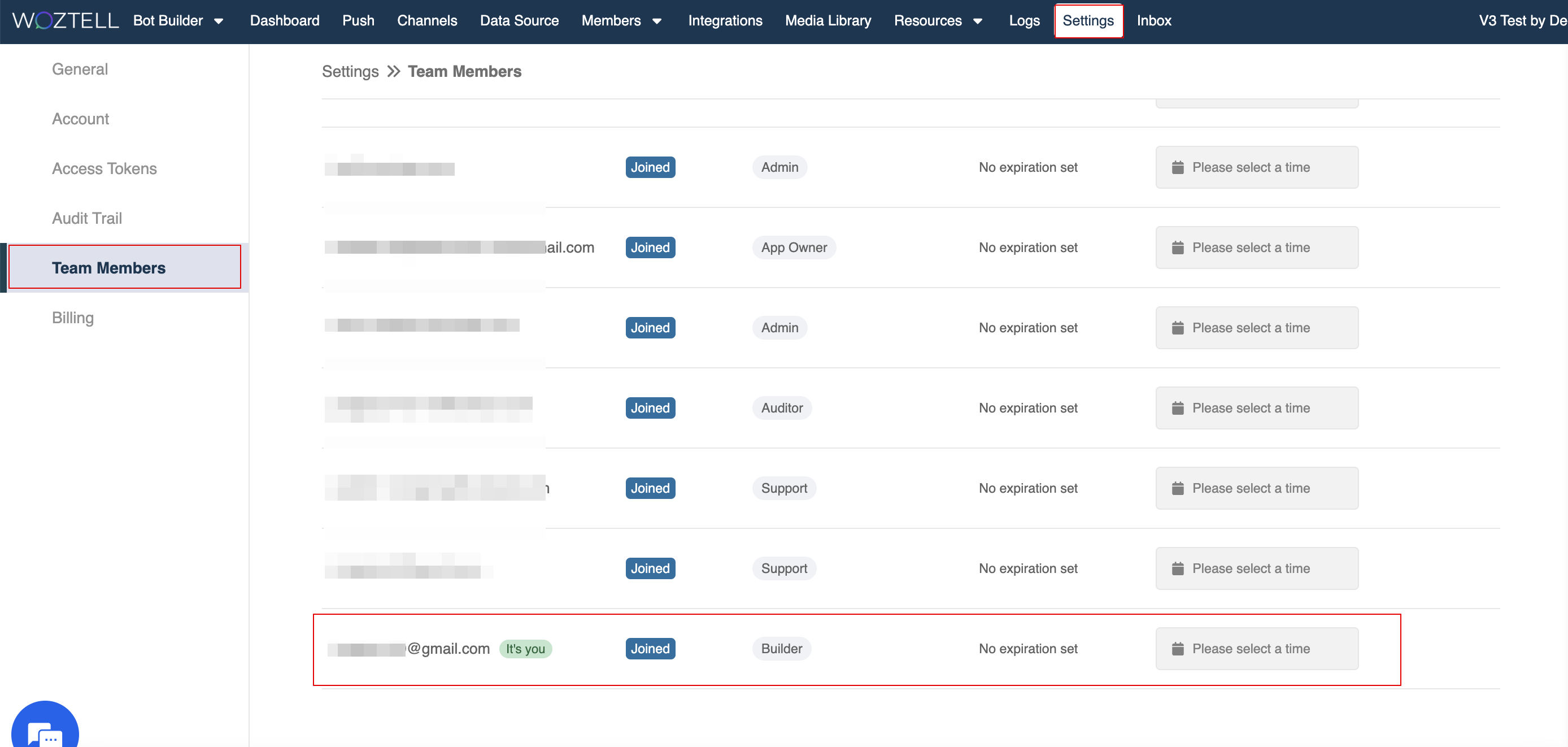 App Owner and Admin can invite new team members, and multiple members can be invited at a time. Before sending the invitation, you need to assign a Role and Expiration (Optional) to each team member.